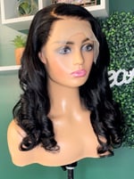 Blunt cut natural dark brown, pre-lightened knots, wavy texture, hand curled.